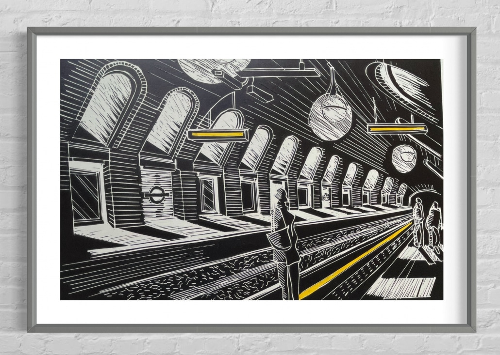 Limited edition of 50 signed and numbered lino cut prints of Baker Street Underground- Circle Line